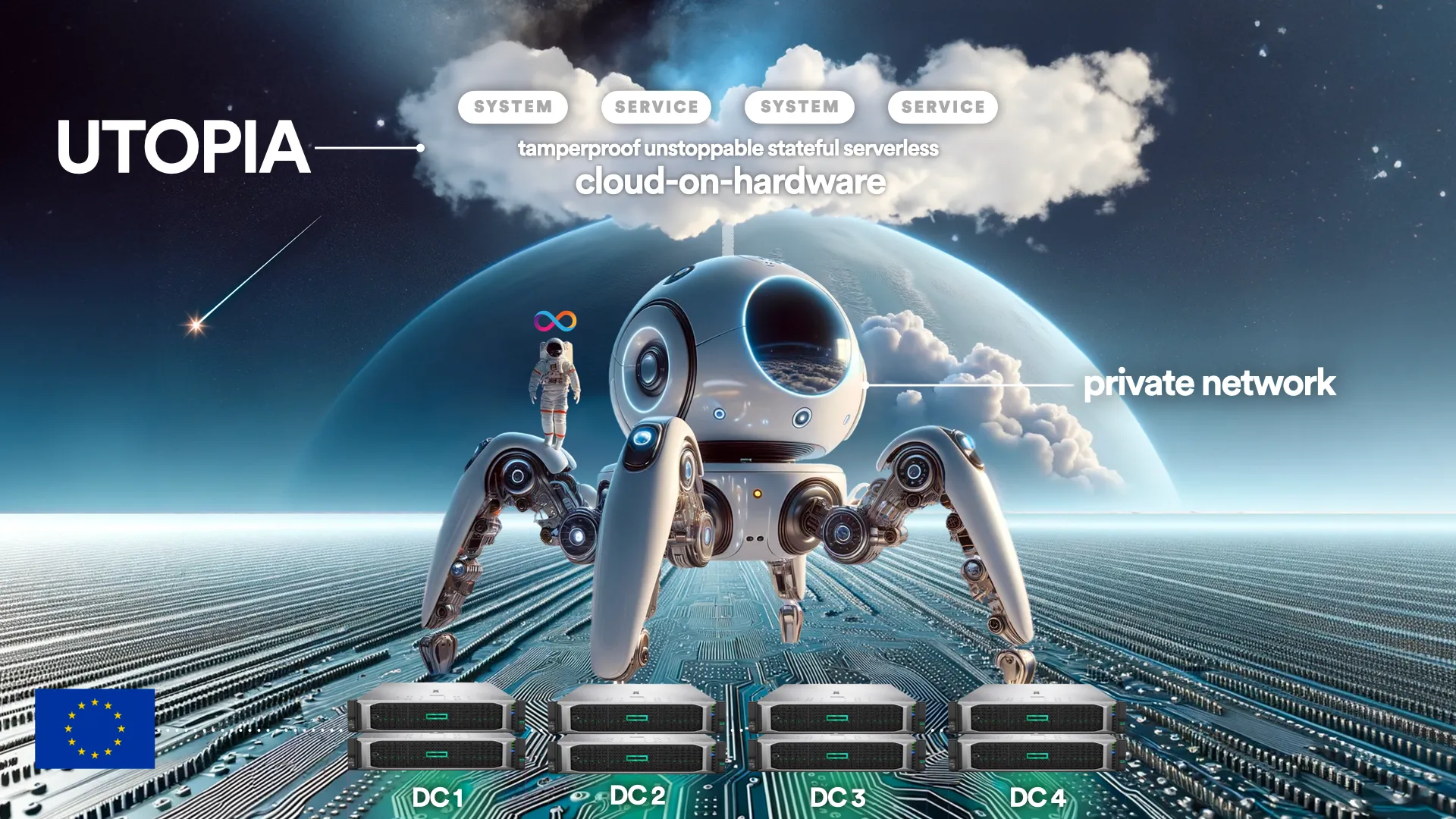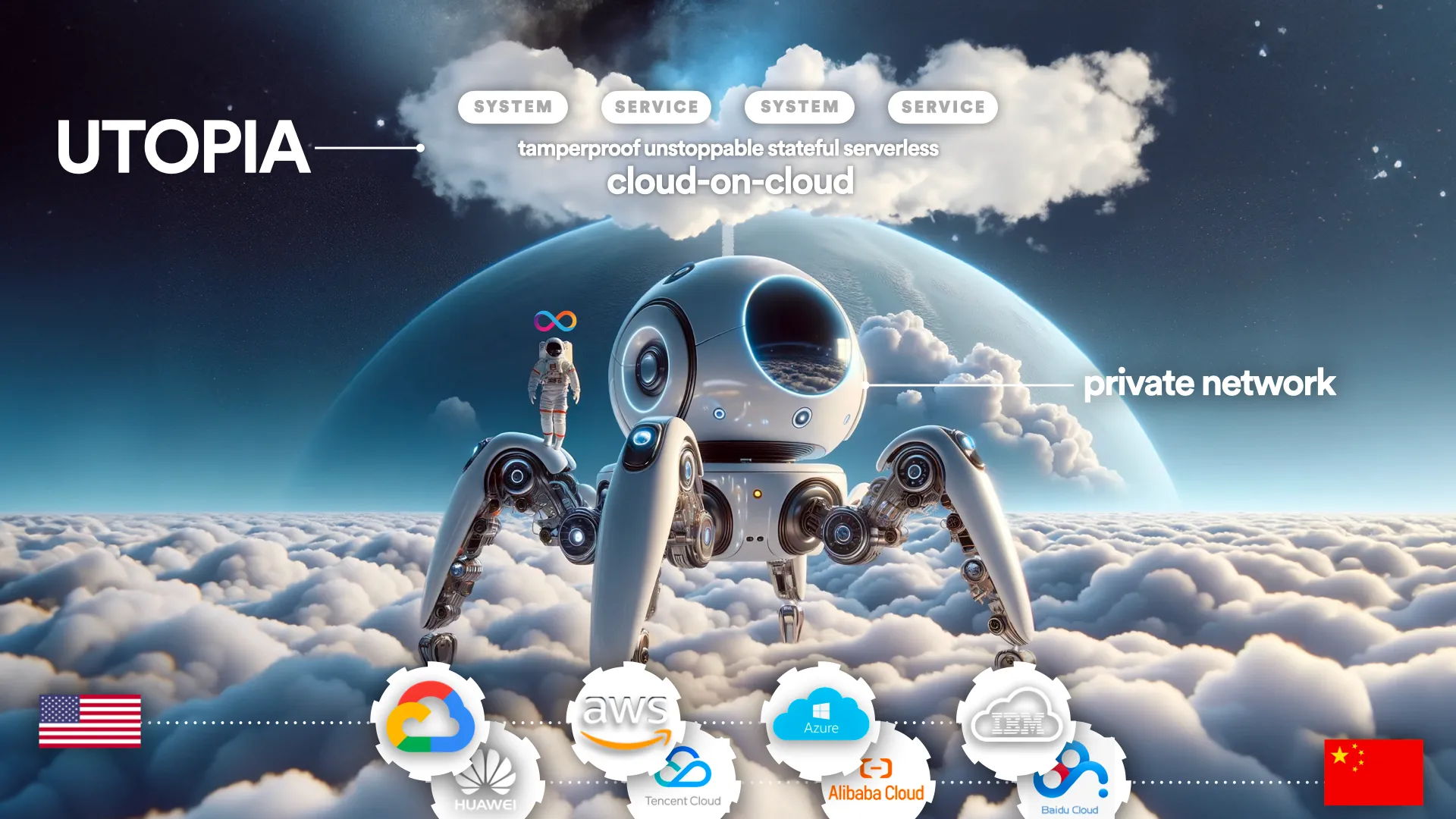 A UTOPIA network can be conceptualized as a robotic spider, whose legs stand on nodes (such as a Google compute instance, or a dedicated server machine) that hosts a serverless cloud on its back, which hosts secure and resilient services — which don't even need the protections of fallible cybersecurity measures like firewalls.